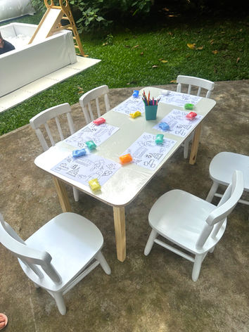 Mesinhas de atividades para as crianças poderem colorir, brincar de massinha, fazer arte e comer os doces e salgados durante a festa